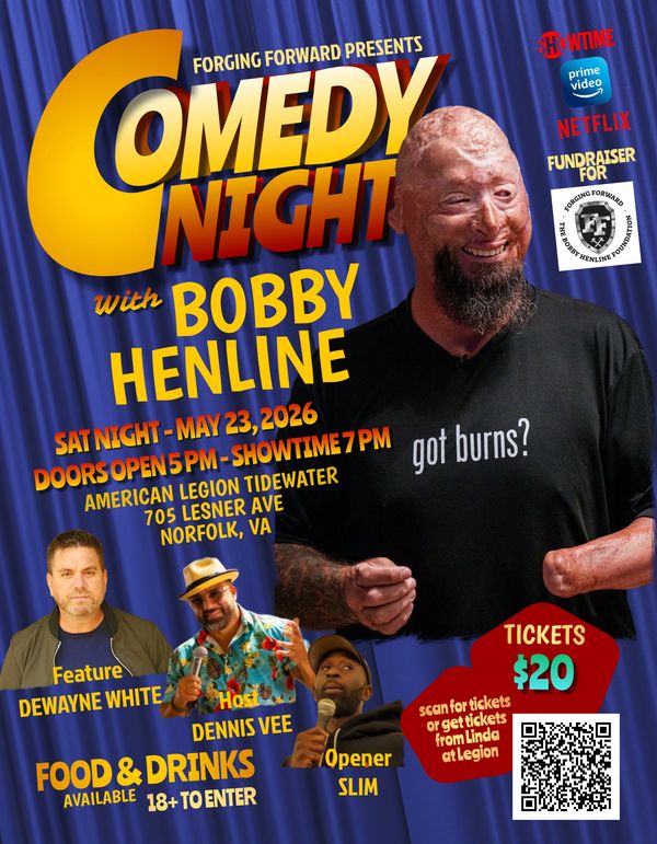 Forging Forward, The Bobby Henline Foundation and Bobby Henline Comedy present Stand Up Comedy with Bobby Henline and Friends, featuring Dewayne White, opener Slim, and host Dennis Vee.