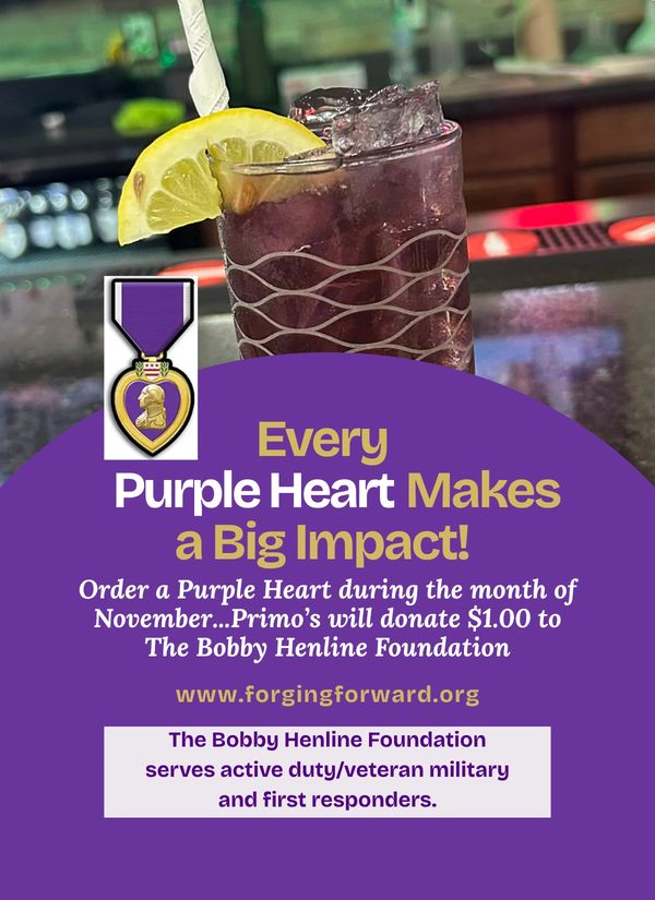 During the month of November, Primo's Bar & Grill is donating $1.00 for each Purple Heart drink sold to Forging Forward, The Bobby Henline Foundation.